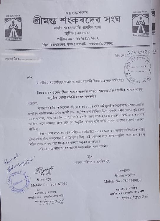 চৰাইদেউৰ পৰা ৰাজু গগৈ ৰিপ’ৰ্ট , দুৰ্নীতিৰ দৰ্পণ সেৱা ২৩ এপ্ৰিল ২০২৬ : চৰাইদেউ জিলাৰ সাপেখাটী ৰাজহ চক্ৰ অন্তৰ্গত চৰাইপুঙ আৰক্ষী থানাৰ চৰাইদেউ জিলাৰ সাপেখাটী ৰাজহ চক্ৰৰ অন্তৰ্গত চৰাইপুং আৰক্ষী থানাৰ এলেকাধীন এক নং চৰাইপুঙৰ বিমলাপুৰ চাহ বাগিচাৰ খেল পথাৰ শেহতীয়াকৈ যোৱা এটা বছৰৰ পৰা অন লাইন উপহাৰ কুপন লটাৰী খেলৰ কেন্দ্ৰ হিচাপে পৰিগণিত হৈ সৰ্বত্ৰে চৰ্চাৰ কেন্দ্ৰবিন্দু হৈ পৰিছে। উল্লেখ্য কৰা প্ৰয়োজন শ্ৰী মন্ত শংকৰদেৱ সংঘৰ লাহদৈ শংকৰজ্যোতি প্ৰাথমিক শাখাৰ নামত কোনো দুষ্ট যোৱা ২০২৫ বৰ্ষৰ আগষ্ট মাহত এখন ভুৱা অনলাইন লটাৰী অনুষ্ঠিত কৰি অনলাইনৰ জৰিয়তে বৃহৎ পৰিমাণৰ ধন সংগ্ৰহ কৰে । উক্ত খেল খনৰ বিষয়ে সামাজিক মাধ্যমৰ জৰিয়তে অৱগত হৈ লাহদৈ শংকৰজ্যোতি প্ৰাথমিক শাখাই স্হানীয় চৰাইপুং আৰক্ষী থানাত গোচৰ দিয়ে যদিও পুনৰ লাহদৈ শংকৰজ্যোতি প্ৰাথমিক শাখাৰ নামগৃহৰ নামত চলিত বৰ্ষৰ যোৱা ইংৰাজী ক্ৰমে ৩ মাৰ্চ , ৭ মাৰ্চ আৰু ৩০ মাৰ্চ তাৰিখে বিমলাপুনৰ চাহ বাগিচাৰ খেলপথাৰত খেলা অনুষ্ঠিত কৰা বুলি ছ’চিয়েল মিডিয়াত প্ৰচাৰ কৰি একেটা শংকৰদেৱৰ সংঘৰ নামগৃহৰ নামত পুনৰ ভুৱা অনলাইন লটাৰী খেল অনুষ্ঠিত কৰি পুনৰ দুষ্ট চক্ৰই বৃহৎ পৰিমাণৰ ধন সংগ্ৰহ কৰে বুলি জানিব পৰা গৈছে।ভুৱা অনলাইন লটাৰী খেল চৰাইপুঙৰ বিমলাপুৰ চাহ বাগিচাৰ খেলপথাৰত অনুষ্ঠিত কৰা হৈছিল বুলি প্ৰচাৰ কৰি বৃহৎ লটাৰীৰ জাল পেলোৱা দুষ্ট চক্ৰৰ এনে কাৰ্যত বিমালাপুৰৰ লগতে সমগ্ৰ চৰাইপুঙ অঞ্চলৰ ৰাইজৰ মাজত বিৰুপ প্ৰভাৱ পৰিছে । উল্লেখযোগ্য যোৱা ২০২৪ বৰ্ষৰ ৩১ জুলাইত বিমলাপুৰ চাহ বাগিচাৰ খেলপথাৰত ১ নং চৰাইপুঙত অৱস্থিত শ্ৰী মন্ত শংকৰদেৱ সংঘৰ লাহদৈ শংকৰজ্যোতি প্ৰাথমিক শাখাৰ নামত নামগৃহৰ দুজন মান সঙ্গী সহিতে কেইজনমান যুৱকে এখন উপহাৰ কুপন খেল অনুষ্ঠিত কৰিছিল । উক্ত খেল খনৰ পৰা লাভ হোৱা অংশৰ পৰা নূন্যতম এক লাখ টকা নামগৃহলৈ দান সূত্ৰে আগবঢ়াইছিল । উক্ত উপহাৰ কুপন খেল খনেই লাহদৈ শংকৰজ্যোতি প্ৰাথমিক শাখাৰ নাম গৃহৰ নামত খেলুৱা প্ৰথম আৰু শেষ খেল । নাম গৃহৰ পৰিচালনা সমিতিৰ সভাপতি ধ্ৰুৱ গগৈ আৰু সম্পাদক যাদৱ শইকীয়া সহিতে ৰাইজে সংবাদ মাধ্যমলৈ প্ৰেৰণ কৰা এক প্ৰেছ বিবৃতিৰ জৰিয়তে জানিবলৈ দিছে যে উক্ত খেল খনৰ পাছত উক্ত নাম গৃহৰ নামত কোনো ধৰণৰ অফ লাইন অথবা অনলাইন লটাৰী খেল অনুষ্ঠিত কৰা হোৱা নাই আৰু ভৱিষ্যতেও খেলুৱাৰ সম্ভাৱনা নাই । কোনো দুষ্ট চক্ৰই বাৰে বাৰে লাহদৈ শংকৰজ্যোতি নাম গৃহৰ নামত পুনৰ ভুৱা অনলাইন লটাৰীৰ খেল অনুষ্ঠিত কৰি সৰ্বসাধাৰণ ৰাইজক ঠগি বৃহৎ পৰিমাণৰ ধন সংগ্ৰহ কৰি থকা কাৰ্যৰিৰুদ্ধে নামগৃহৰ পৰিচালনা সমিতিৰ ফালৰ পৰা পুনৰ গত ইংৰাজী পাচঁ এপ্ৰিল তাৰিখে স্হানীয় আৰক্ষী চকীত এজাহাৰ দাখিল কৰাৰ উপৰিও চৰাইদেউ জিলাৰ আৰক্ষী 