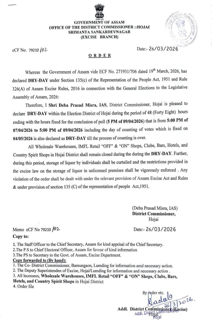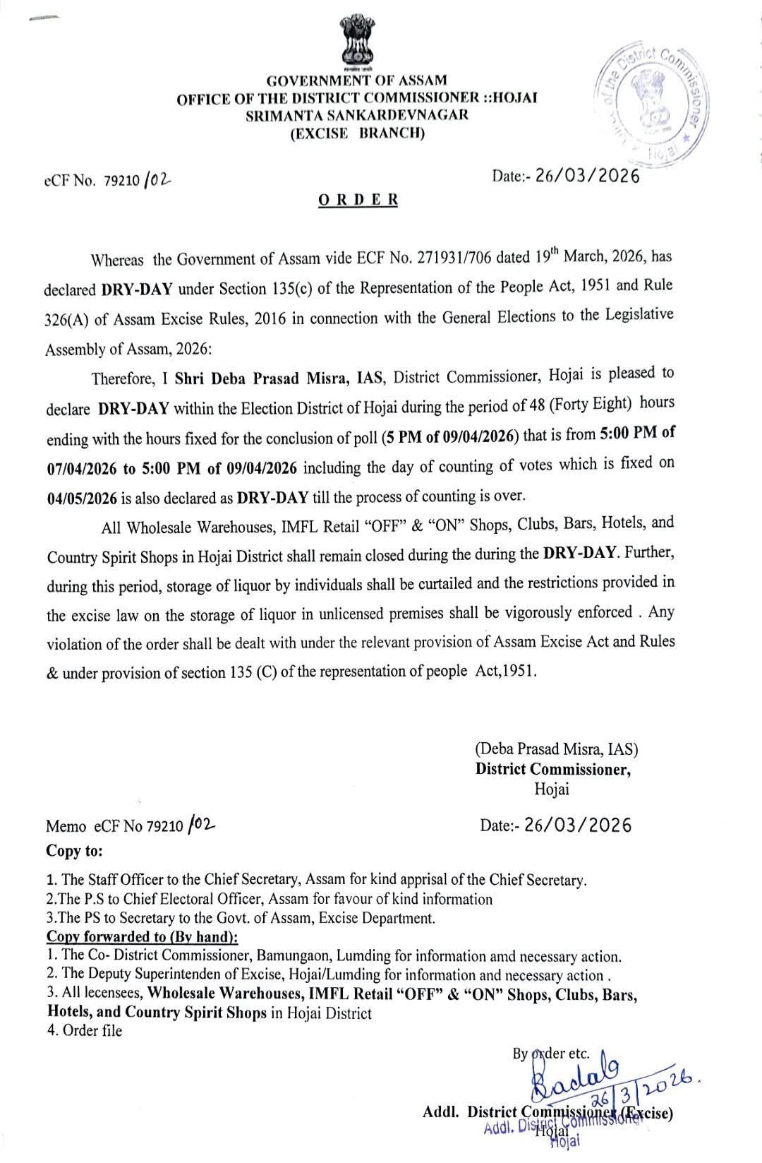 হোজাই জিলাত ’ড্ৰাই ডে’ ঘোষণা, অসম বিধানসভাৰ সাধাৰণ নিৰ্বাচন ২০২৬-ৰ পৰিপ্ৰেক্ষিতত অসম